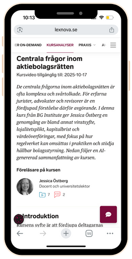 Kursanalyser är AI-genererade sammanfattningar av våra digitala heldagskurser – granskade av våra jurister. Analyserna gör det enkelt att hitta relevant kunskap, förstå helheten och fördjupa dig i det du behöver.
